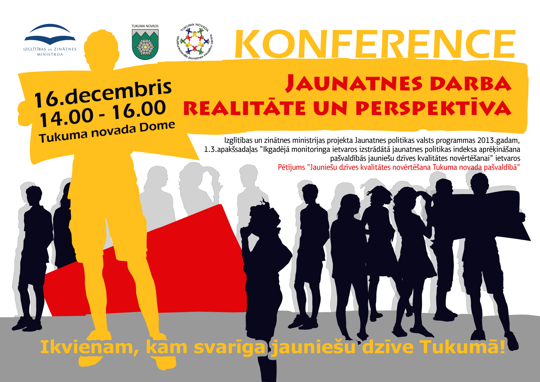 Aicinām ikvienu interesentu piedalīties projekta „Jauniešu dzīves kvalitātes novērtēšana Tukuma novada pašvaldībā" noslēguma konferencē „Jaunatnes darba realitāte un perspektīva", kas notiks 2013. gada 16.decembrī, no plkst. 14.00 līdz 16.00, Tukuma novada Domes konferenču zālē. (Tukums, Talsu iela 4, 2. stāvs)